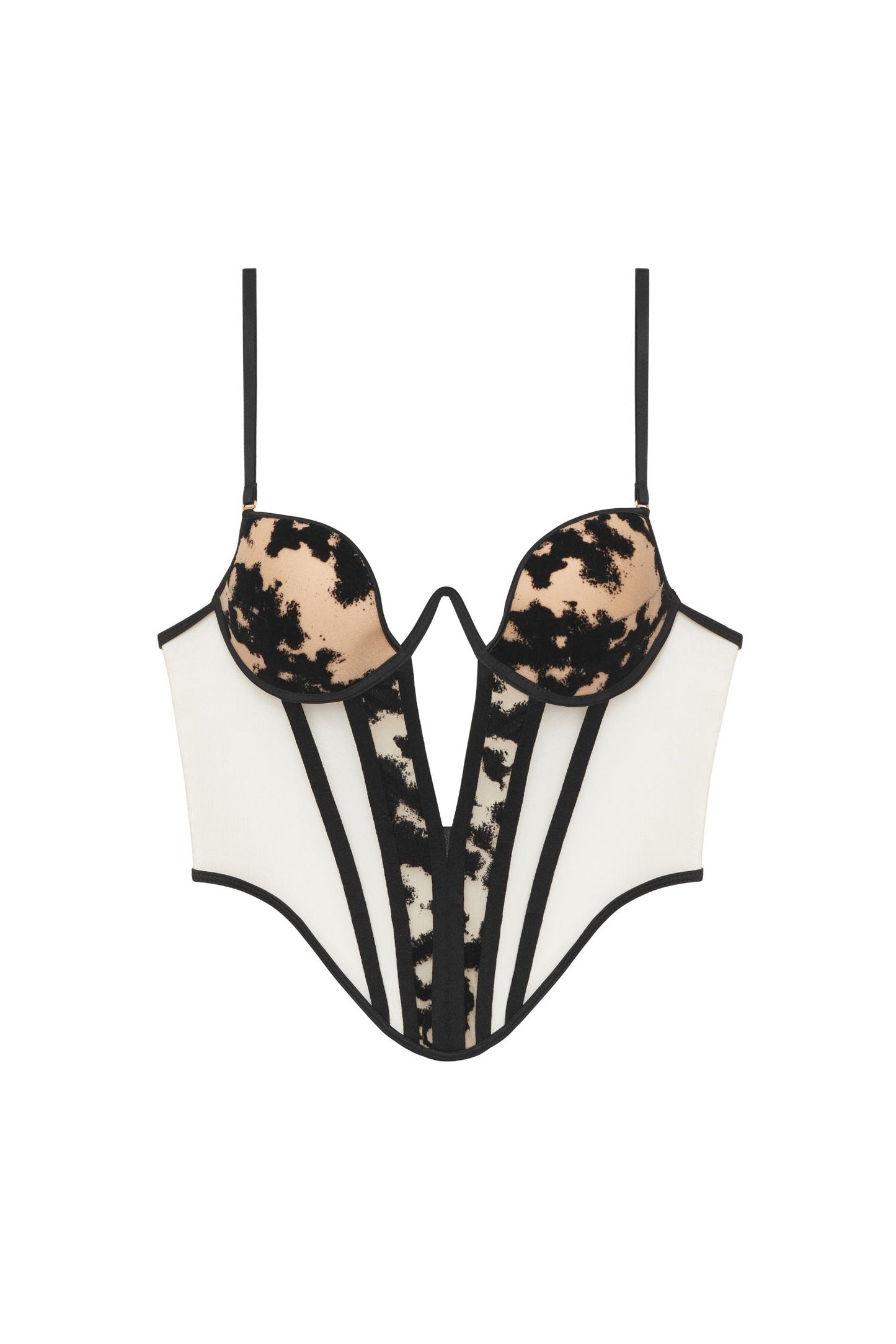 Das sorgfältig entworfene Harlow-Korsett verfügt über bequeme integrierte Bügel und verstellbare Träger für tadellosen Halt und Passform. Dieses sorgfältig aus hochwertigsten Materialien wie Flockstoff und luxuriösem Samtmuster gefertigte Korsett bietet dank seiner konturierten Körbchen und des taillierten Schnitts eine bequeme Passform und eine formende Silhouette.