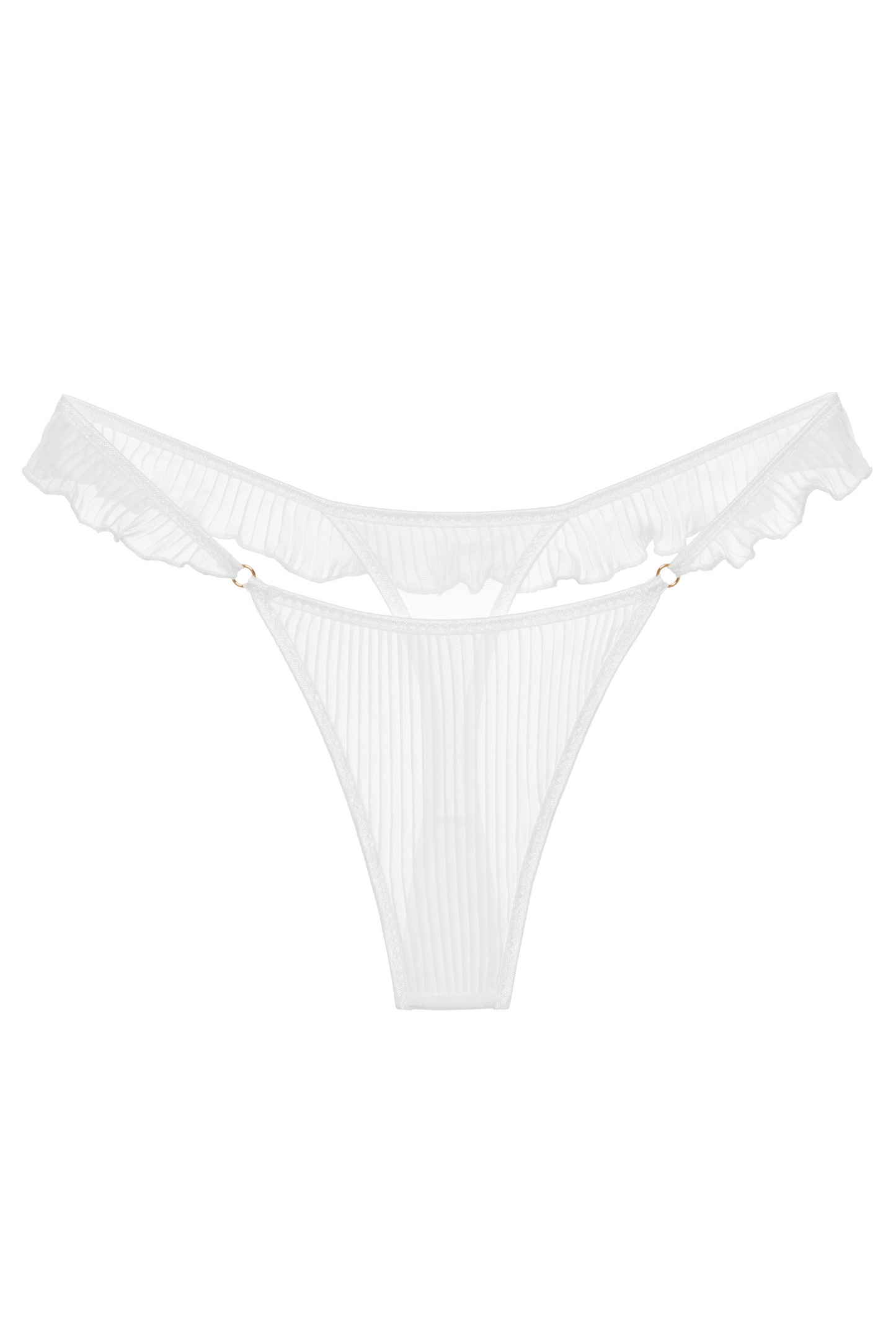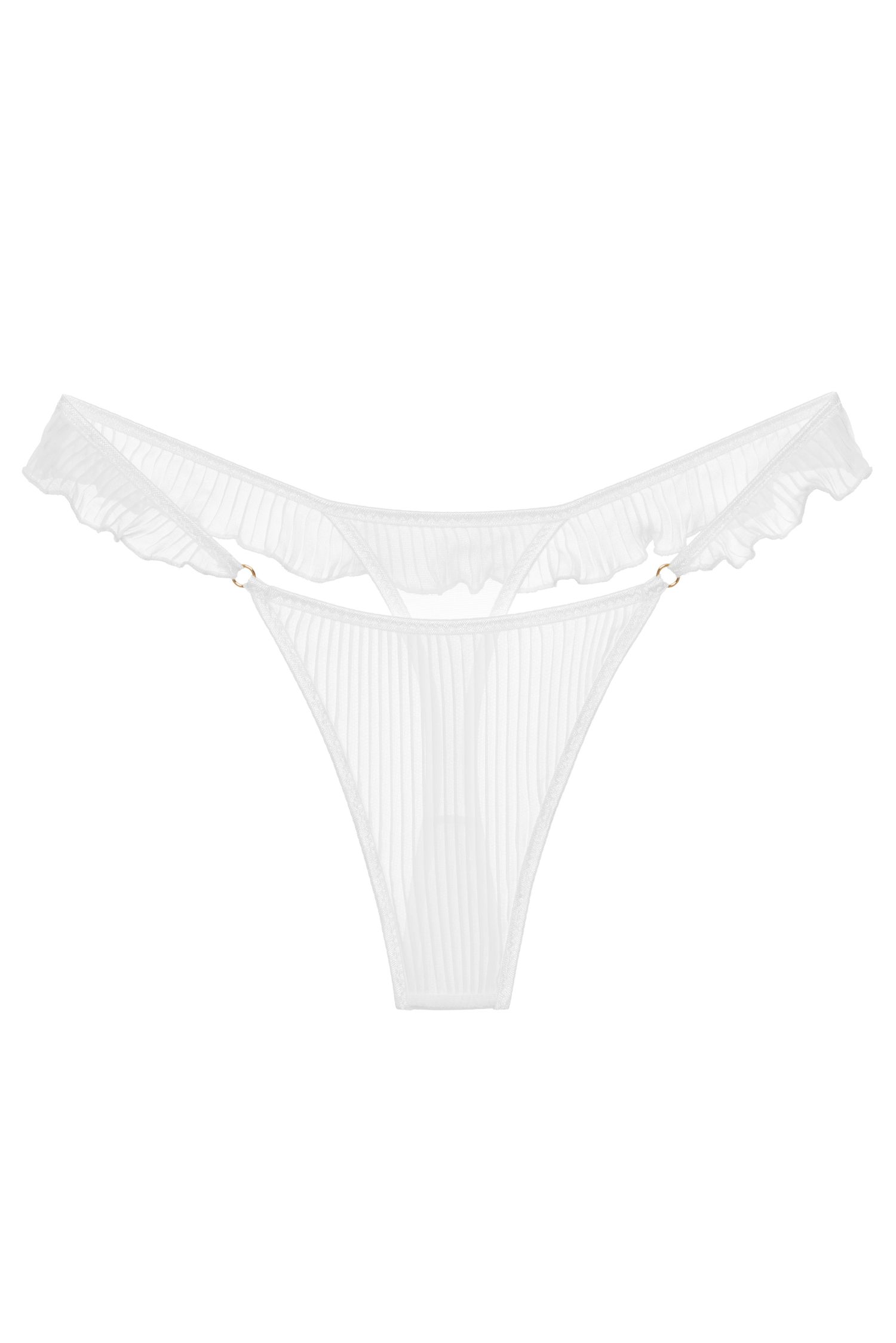 Stringi są wykonane z plisowanego materiału i mają falbankowe brzegi wzdłuż krawędzi. Flavia to wybór idealny na wyjątkowe okazje, gdzie styl i elegancja są na pierwszym planie.